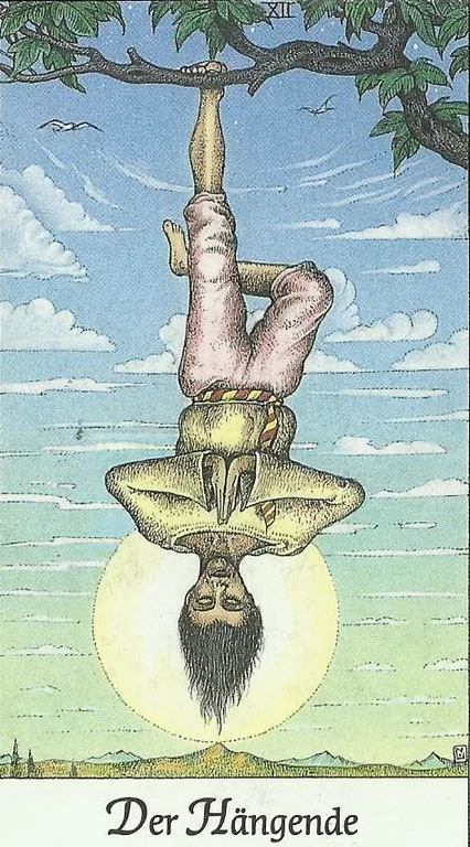 Ich deute die Karte so, dass die Situation zu "klemmen scheint " und man muss gründlich nachdenken und eventuell sogar entgegen dem Handeln, wie man es sonst würde. Die Karte sagt: "Sieh dir alles aus einer Perspektive an, dann wird es gelöst.
